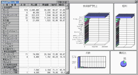 様々な部門・分類・エリア・来店時間・スタッフ別のレポートをします: