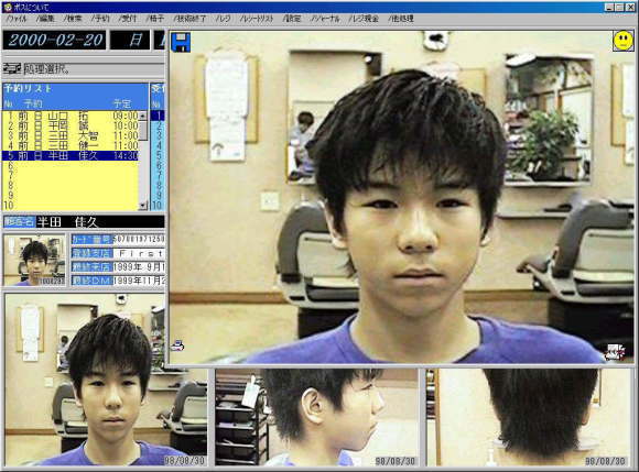 | レジ画面での画像表示: ボタン一つでお客様のフロント・サイド・バックの画像から拡大画像まで爆速で表示されます。 他のシステムと違い、いちいち別の画面を開くという愚かな方法ではありません。 セカンドファイルのBossの族上がりはだてではありません。 画像のお客様へのサービス: アイコンクリックでフロッピーへお客様の今までの画像をすべて保存出来ます。 又、印刷もその場でOkです。 画像の編集: 画像編集ソフト・ヘアスタイルのカタログソフト等へ、アイコンクリックでお客様の名前で画像 を渡せます。 画像保存枚数制限について: お客様の画像の保存枚数は残念ながら無制限とさせて頂きます。 (注!)お客様のデータ及び画像は大切なデータですので扱いには細心の注意をしてください。 |