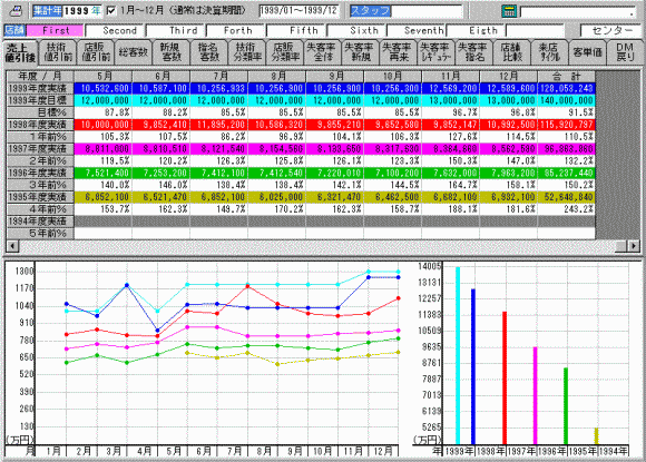 | 全ての12ヶ月分の集計結果が昨年対比〜5年前対比で集計値とグラフでレポート: 集計数値と月別のグラフと、年度別対比グラフを同時に表示しています。 多店舗展開のサロンでは、店舗別・全店舗合計で。 ◆売上(総売上・技術売上・店販売上) ◆来店客数(新規客数・指名客数) ◆パーマ率・カット率・カラー率はもとより様々な技術分類率・売上 ◆メーカー別・シャンプー・スタイリング剤等の店販分類率・売上 ◆失客率(新規・再来・固定客・全技術・技術別・店舗別・全店舗・スタッフ別) ◆来店サイクル(お客様の来店サイクルの動向を把握し、メニュー構成等を見直すことも大事) ◆客単価 ( 〃 ) ◆DM戻率 (効率の良いDM戦略を、データを基に追求していくことも大事) |