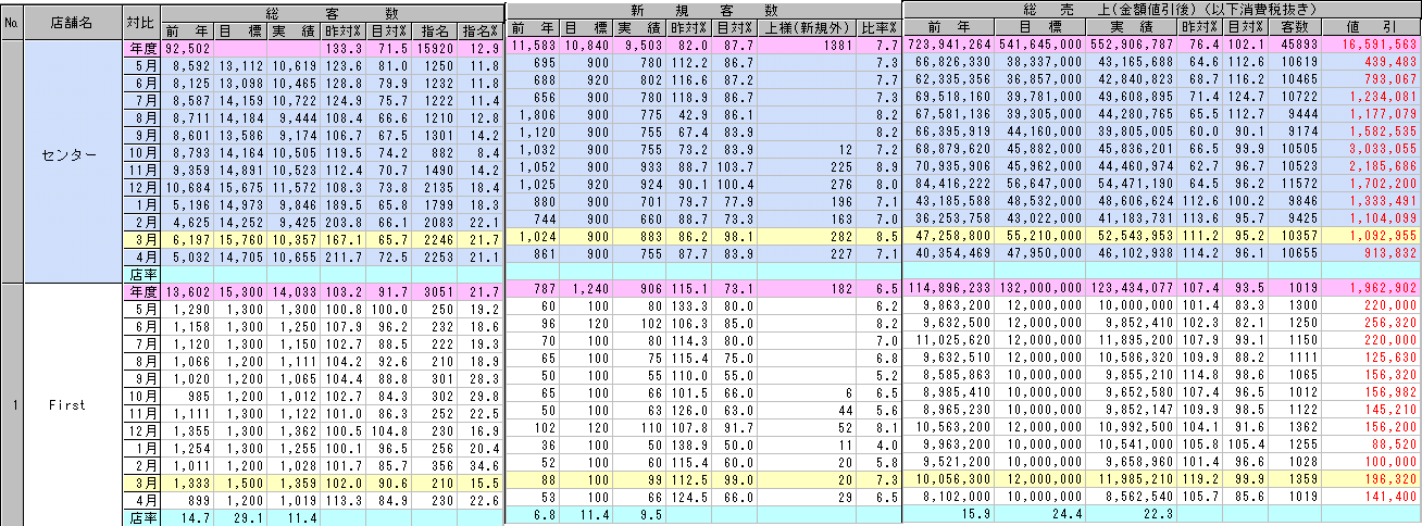 全店舗の12ヶ月分の集計結果の昨年対比・目標対比: