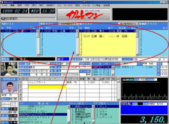 | この画面がレジ画面: 赤丸で囲まれた部分が、左から順に 予約リスト → 受付リスト → イスリスト → 精算終了リスト お客様の来店されてから、お帰りになるまでの流れの中でお店の現在の状況が一目で把握できま す。 予約リスト: お店の開店時にレジを起動した時に、前日からの本日の予約のお客様が時間順にこのリストボ ックスの中に入っています。前日からの予約客と当日の予約客との区別と、技術メニューが確 認出来るようになっています。 受付リスト: 来店されたお客様をカードもしくはTEL・ルビで呼び出しますと、まず受付リストに入りま す。予約リストボックスに入っているお客様が来店されると、レジの【次へ→】キーで受け付 けへ通します。呼び出しされたお客様は、大きな画像が瞬時に表示されますので次にイスへご 案内する時もお客様のお顔を確認してご案内出来ますのでお客様にとってもスタッフにとって も最大の安心と信用が得られます。受付リストで、予定時間・メニュー・担当スタッフ・指名 等の情報も更新できます。さらに、お母様とお子さまが来店されて先にお子さまの精算を終了 されることも可能です。(この場合は、精算終了を画面上で確認でき・技術が終了されて精算 時には、「精算済み」のメッセージがでますのでとっても安心です。) イスリスト: 予め、お客様の本日のメニューを設定する事により予定終了時間が表示されると同時に担当ス タッフも一覧確認できますのでリアルアイムの予約受付の時間・技術開始時間を的確にお客様 へアナウンスできお店の信用度アップにつながります。 技術終了リスト: サロンの日常の流れを徹底的に見つめ、精算忘れ等のケアミスで、お客様にご迷惑をお掛けし ないように技術終了されたお客様でまだ精算終了のされていないお客様を一端、技術終了リス トボックスに通すというシステムにしました。 この機能・考え方ひとつを取ってみても『美々っとクラブ』が如何にサロン側にたって作成さ れたシステムかお解り頂けると思います。 精算終了リスト: この画面には表示されていませんが、ボタンひとつで当日の精算終了のお客様が呼び出しでき ます。スタッフのポイント・カルテ内容の編集等の作業もスピィーディーにできます。 |