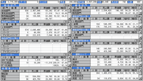 様々な部門・分類・エリア・来店時間・スタッフ別のレポートをします: