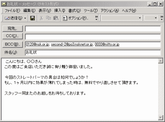 | DMは重要な営業戦略です。でもこの時代にハガキDMのみで、恥ずかしくないですか: DMは重要な営業戦略です。 バースデイDM (年に1回のお客様への還元です。思い切って!) 見込み客DM (来店サイクルを確実に縮めます。) 掘り起こしDM (ごぶさたなお客様も、また来店して下さるかもね。) キャンペーン・プレゼントDM (人間とは、単純なものですよ。) 年賀状に暑中見舞いDM (当然!) サンキューDM (特に、新規のお客様には効果絶大。) 来店回数の3回目〜4回目が一番失客率が高くなります。いわゆる再来客へのDMは大切です。 上記、全て実行していて、当たり前です。 もし実行していなかったら今からでもやってください。やりだしたら、止めないでください。 必ず良い結果はでます!。でも、野別幕なしでは、迷惑DMになるだけですよ!。 IT(インターネット)時代に、ハガキDMのみでお客様とのコミケをとっているそこのアナタ !しかも裏の文章を自分達で考えるならならまだしも、定型のおまかせ文章・キャラが便利に出 てくる化石時代の”スマート”なシステムで進んでいると喜んでいるアナタ! 本当に、お客様にお店の気持ちが伝わっていると思っているのでしょうか? DMの裏の文面は、自分たちで考ましょう。便利な機能は使えばいいですが内容くらいは.ね。 それをやってから次に、経費を考えて下さい。 ハガキDMですと、1枚当たり70円程度かかります。 例えば、500人にDMを郵送すれば35,000円の経費ですね。ところがE_Mailを使 ったらどうでしょう。500人に、”せぇーの”で送信しても約10円ですよね。 現在『美々っとクラブ』の導入店での、来店客のメールアドレス収集率は10%を越えています 。さらに加速をまして増えてきている現状です。 現在、全国で約28万件の理美容サロンがありますが、自作のホームページを持っているサロン は500件位です。それに比べ『美々っとクラブ』導入店で自前のホ−ムページでネットでお店 の宣伝をしたり、ネットでお客様とのコミケを暖めているサロンは導入店の100%に近い数字 です。インターネットに一番近いサロンシステムが『美々っとクラブ』です。 〜〜〜〜〜〜〜〜〜〜〜〜〜〜〜〜〜〜〜〜〜〜〜〜〜〜〜〜〜〜〜〜〜〜〜〜〜〜〜〜〜〜〜〜 その昔、風車の弥七は、ご隠居がご城下に入る前の情報の収集源は髪結いの亭主でした。 いつもチョンマゲがダンディーに決まっていたのも月曜日の8時に備えて毎週とこやに行ってか らです。由美かおるも、悪者お代官さまの好みとかを美容院へ聞き込みに行ってたそうです。 〜〜〜〜〜〜〜〜〜〜〜〜〜〜〜〜〜〜〜〜〜〜〜〜〜〜〜〜〜〜〜〜〜〜〜〜〜〜〜〜〜〜〜〜 その昔、ヘアサロンは町の情報の発信基地でした。町のことで解らないことがあったら床屋のお っちゃんに聞いて来いと云われていました。 〜〜〜〜〜〜〜〜〜〜〜〜〜〜〜〜〜〜〜〜〜〜〜〜〜〜〜〜〜〜〜〜〜〜〜〜〜〜〜〜〜〜〜〜 インターネットで、メールで、お客様の喜ぶ情報を教えてあげましょう。 真面目に今の時代をとらえて、一歩前にでましょうね!! ※注意:お客様のデータは、お預かりしているものと考え、取り扱いには十分に注意してくださ い。 |